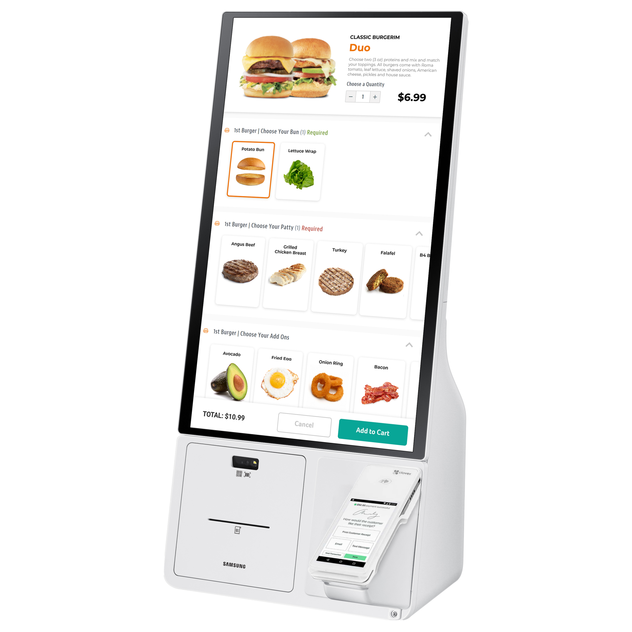 - Le kiosque Samsung, équipé de Clover Flex, redéfinit la commande en libre-service. Son écran tactile intuitif invite vos clients à explorer et commander avec une aisance inégalée.